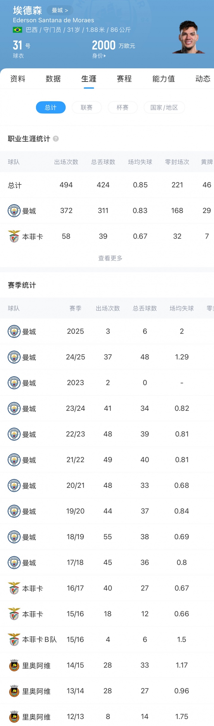 埃德森现年31岁,已为曼城效力8个赛季,目前共计出场372次。